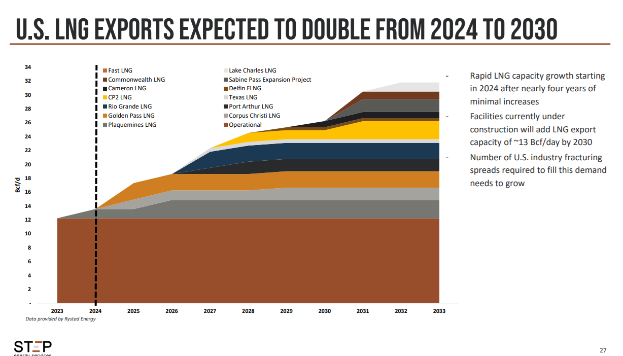 Given recent Golden Pass LNG delays, the current demand ramp in the near-term will have to be domestic related, whether on the power consumption side or if we get a decent winter with some cold heating demand.  Into late 2025, it feels like a reasonable expectations to expect more US LNG natural gas activity. Further, rising US LNG exports may influence NYMEX pricing leading to strength in US domestic natural gas prices int he coming 12 to 18 months which would be supportive of fracturing as well as advancement into lower tier play which could be extra bullish for hydraulic fracturing given higher pumping requirements.|