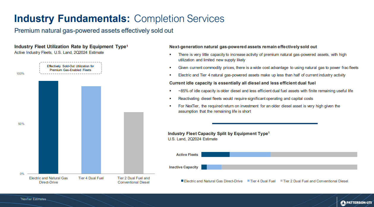 Tier 4 Duel Fuel allows for full methane capture and allows the E&P operator to use ‘pad gas’ from their own source as feedstock, rather then consume diesel which leads to a significant cost saving as well as a massive drop in emissions produced which gives operators ESG bragging rights which are in fact quite important to maintain optics in certain US dry gas regions. The cost savings to an E&P customer from an OFS provider by swinging to Tier 4 from Tier 2 diesel is around ~$10m/fleet on an annualized basis. With the majority of US production pads producing meaningful amounts of associated gas, it makes a lot of sense for E&P to want to use their own pad gas for both environmental and cost savings purposes. It’s safe to say that diesel will increasingly become niché, especially if fuel prices ramp up again.